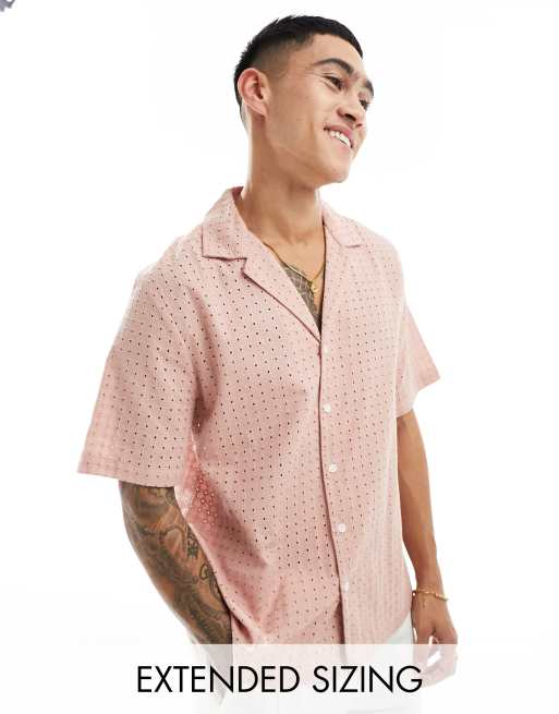 ASOS DESIGN short sleeve relaxed fit revere collar broderie shirt in dusty pink