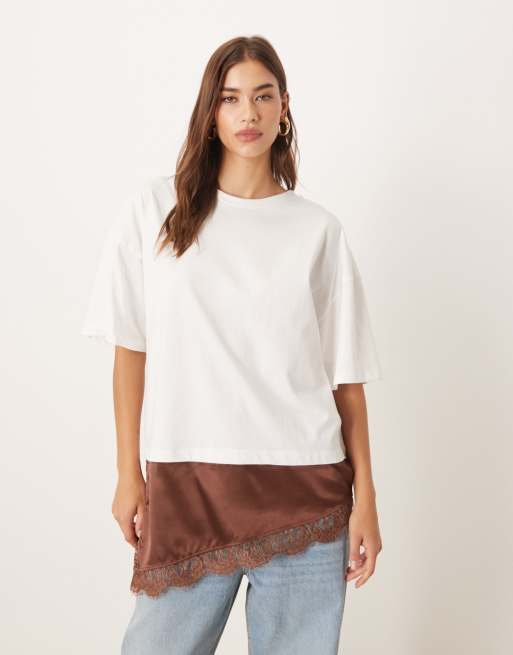 ASOS DESIGN short sleeve t-shirt with satin lace asym hem detail in chocolate