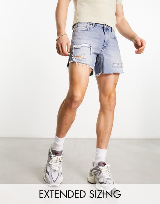 ASOS DESIGN shorter length denim shorts with rips in light wash blue