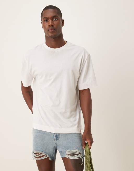 ASOS DESIGN shorter length straight fit denim shorts with rip detail in light wash blue