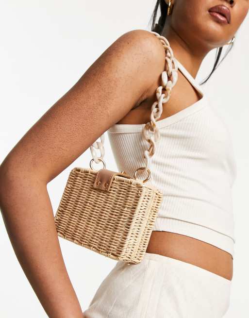 ASOS DESIGN shoulder bag with tort resin handle in rattan straw