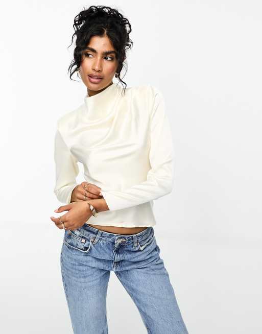 ASOS DESIGN shoulder pad high neck blouse in cream
