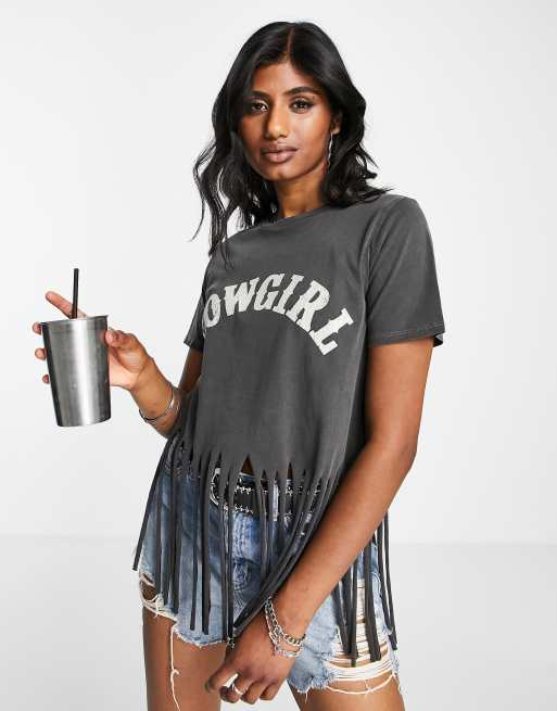 ASOS DESIGN shredded cowgirl graphic tee in washed charcoal