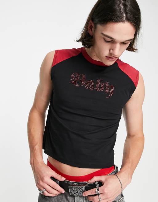 ASOS DESIGN shrunken fit vest in black with 'Baby' diamante text print