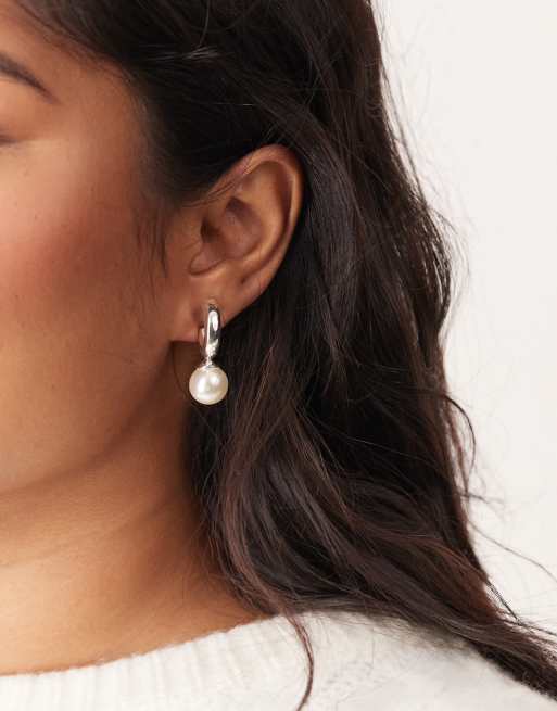 ASOS DESIGN silver plated drop hoop earrings with faux pearl detail