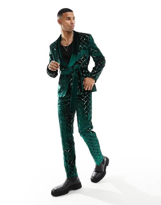 ASOS DESIGN skinny diamond sequin suit trouser in dark green