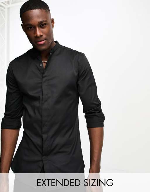 ASOS DESIGN skinny shirt with grandad collar in herringbone texture