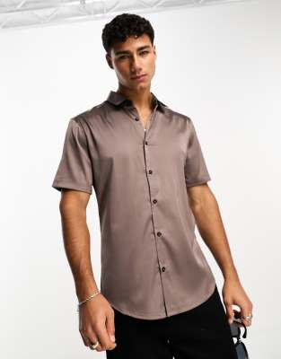 ASOS DESIGN skinny shirt with roll sleeves in slate grey