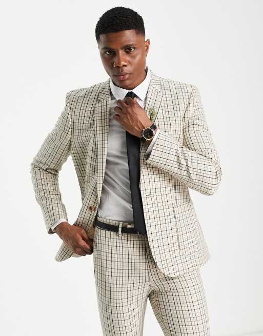 ASOS DESIGN skinny suit jacket in stone and beige micro check