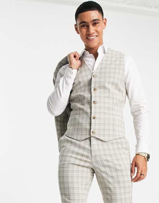 ASOS DESIGN skinny waistcoat in beige and navy highlight grid check