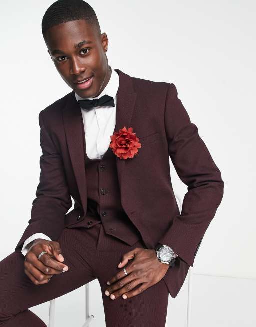 ASOS DESIGN skinny wool mix suit jacket in basketweave texture in burgundy