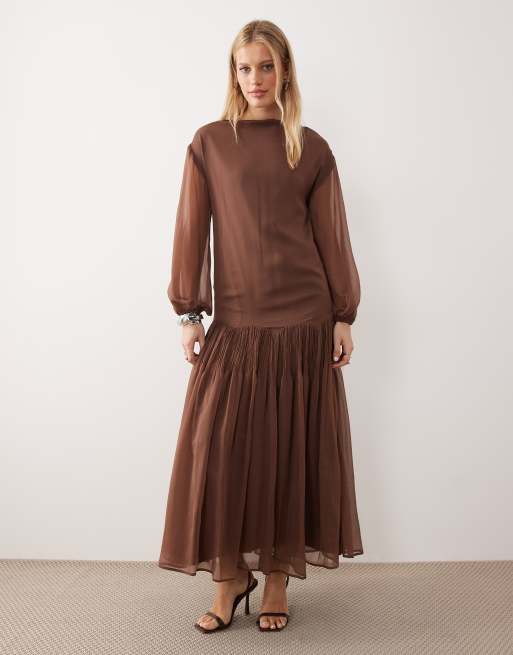 ASOS DESIGN slash neck chiffon godet maxi dress in chocolate