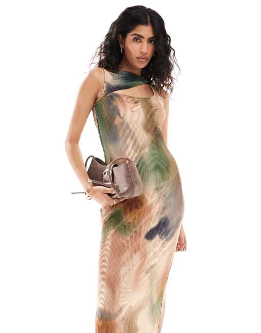 ASOS DESIGN slash neck plisse midi dress with twist in swirl print