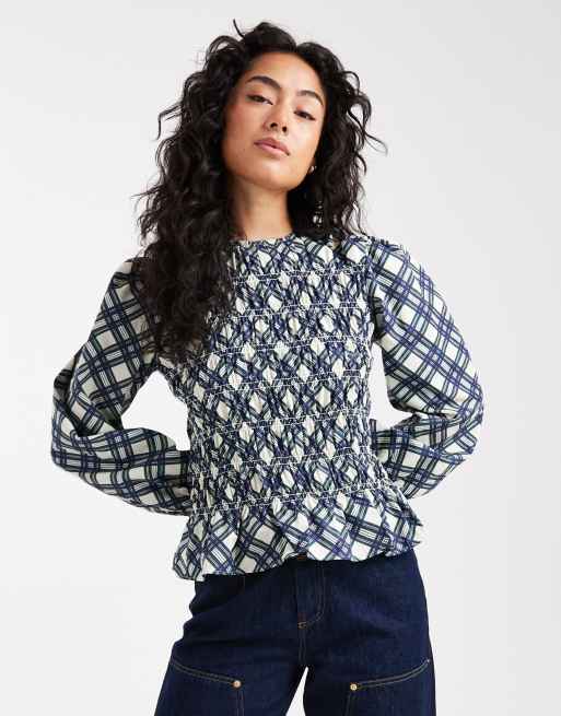 ASOS DESIGN slash neck shirred long sleeve top in check