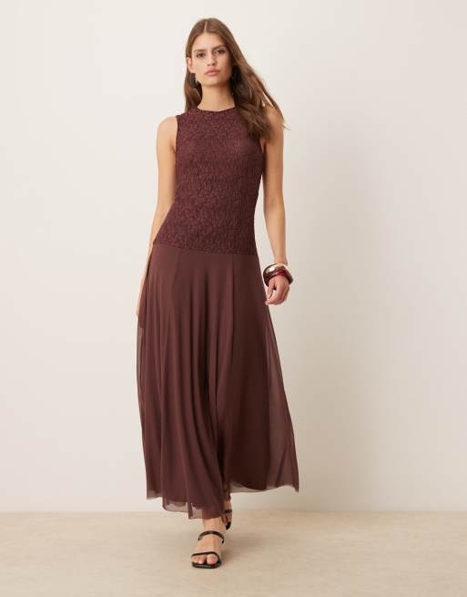 ASOS DESIGN sleeveless lace maxi dress with mesh skirt in chocolate