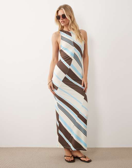 ASOS DESIGN sleeveless maxi dress in blue, brown and cream stripe