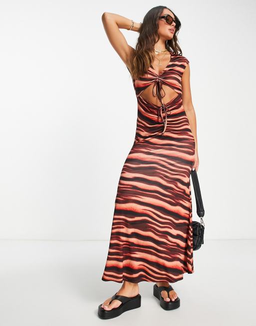 ASOS DESIGN sleeveless midi dress with ruching detail and cut out in orange tiger print
