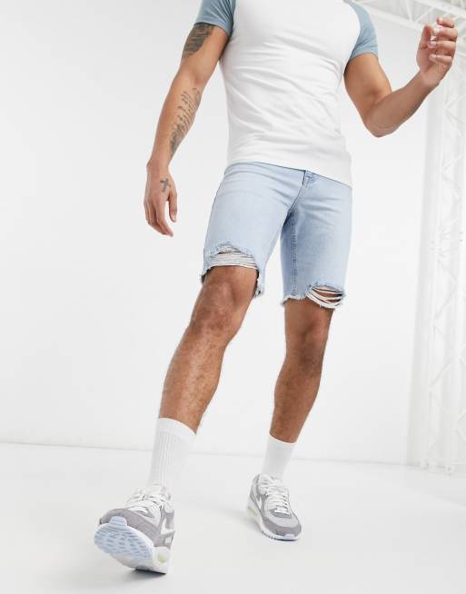 ASOS DESIGN slim denim shorts in light wash blue with raw hem