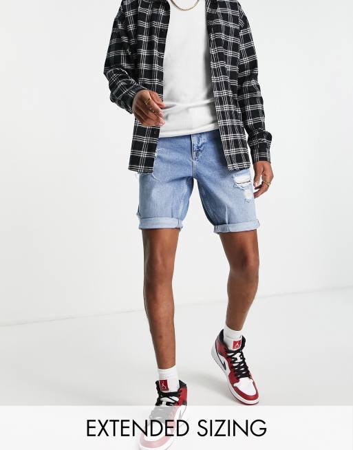 ASOS DESIGN slim denim shorts in mid blue wash with rips