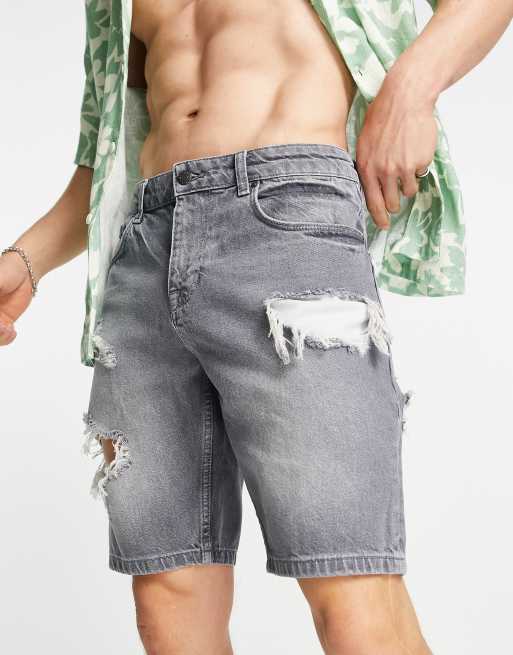 ASOS DESIGN slim denim shorts in washed grey with heavy rips