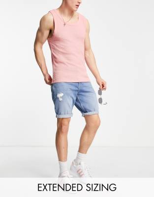 ASOS DESIGN slim denim shorts with abrasions in mid wash