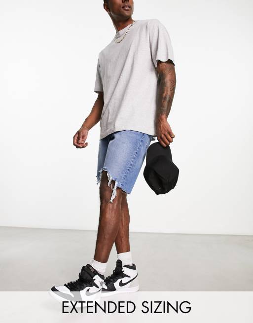 ASOS DESIGN slim regular length denim shorts with rip hem in mid wash blue