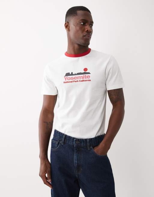 ASOS DESIGN slim ringer t-shirt with Yosemite graphic in cream.