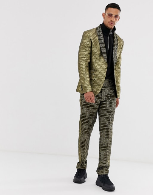 ASOS DESIGN slim suit tuxedo in gold diamond jacquard