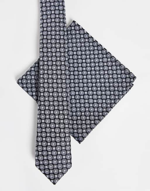 ASOS DESIGN slim tie and pocket square in black and white geo design