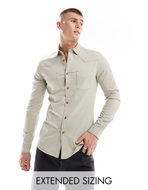 ASOS DESIGN slim western denim shirt with contrast stitching in stone