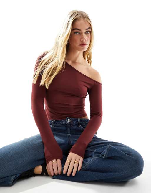 ASOS DESIGN slinky asymmetric long sleeve top in burgundy