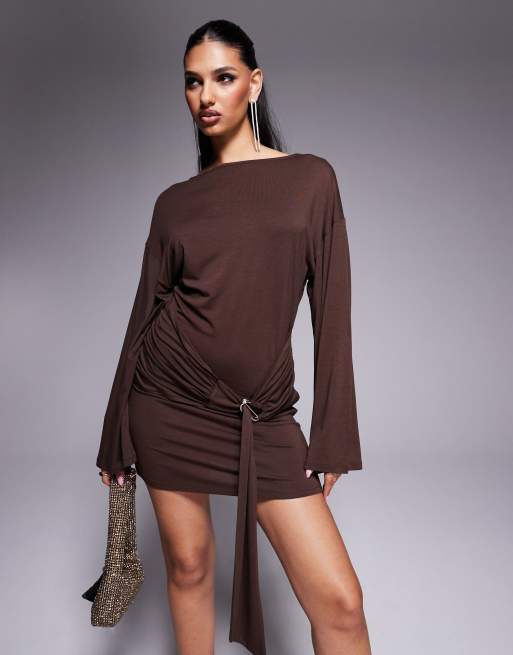 ASOS DESIGN slinky cinched tIe waist belt detail bodycon mini dress in brown