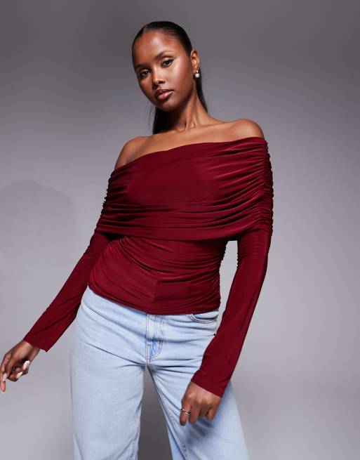 ASOS DESIGN slinky drape bardot long sleeve top in burgundy