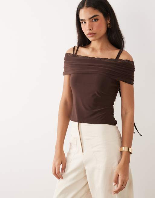 ASOS DESIGN slinky lace trim bandeau top with straps in chocolate