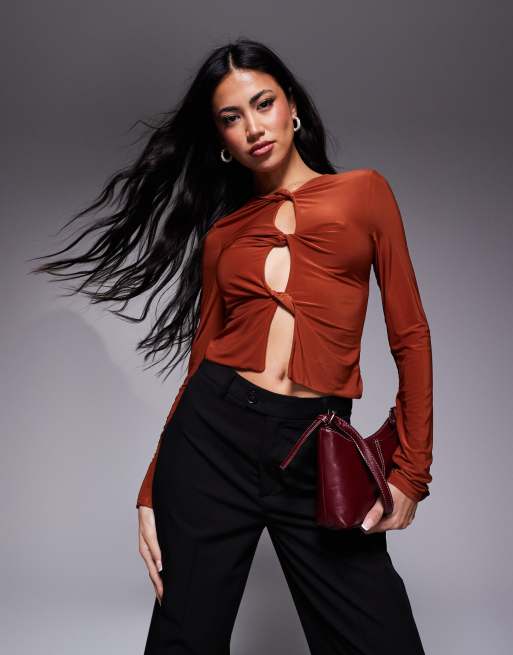 ASOS DESIGN slinky twist front long sleeve top in rust