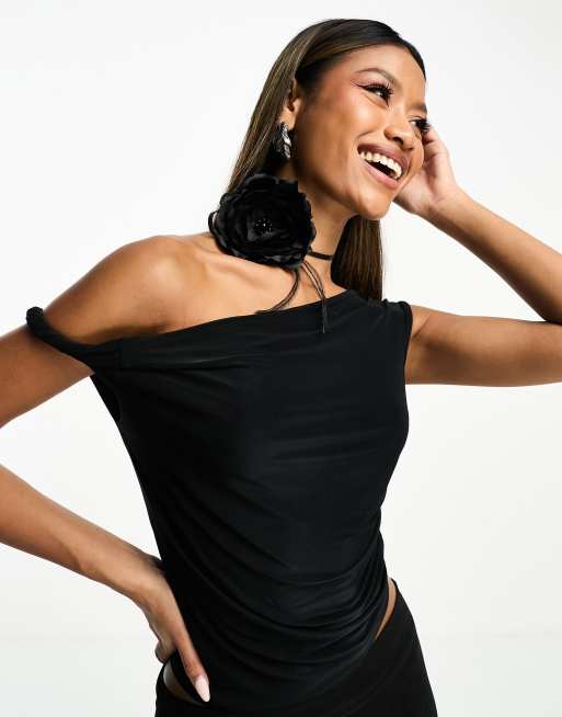 ASOS DESIGN slinky twisted off the shoulder asymmetric top in black