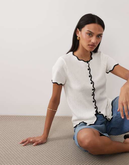 ASOS DESIGN slub yarn cardigan with scallop edges in white and black