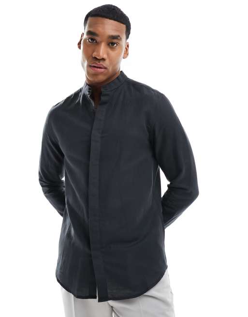 ASOS DESIGN smart linen regular shirt with deep grandad collar in black