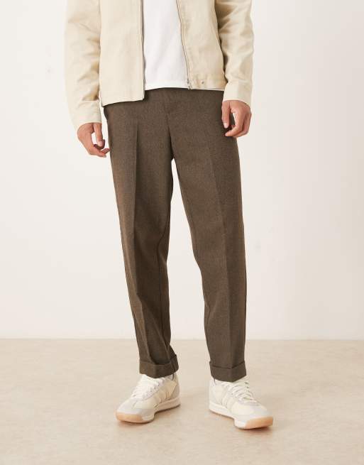ASOS DESIGN smart relaxed tapered trouser with exposed button and turn ups in brown wool