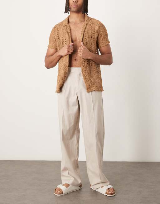 ASOS DESIGN smart wide leg linen blend trousers with front pleat in stone