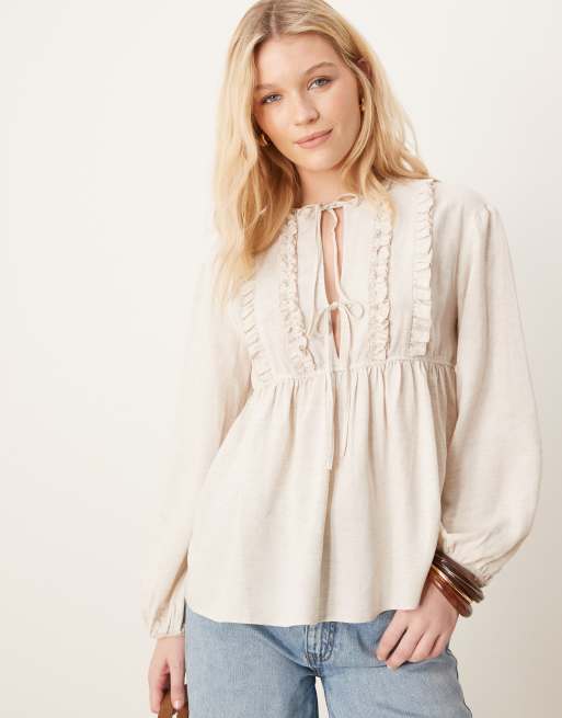 ASOS DESIGN smock with ruffle detail and tie neck in natural