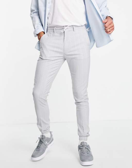 ASOS DESIGN soft tailored skinny suit trousers in light blue pin stripe trouser with drawcord waist