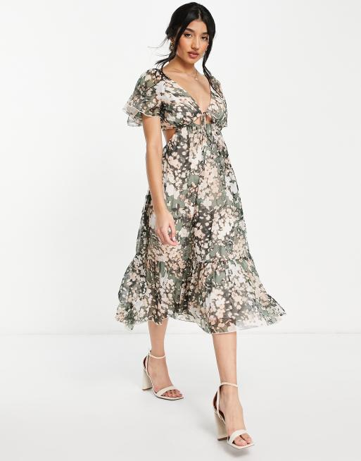 ASOS DESIGN soft tiered midi dress with tie front in blurred floral print