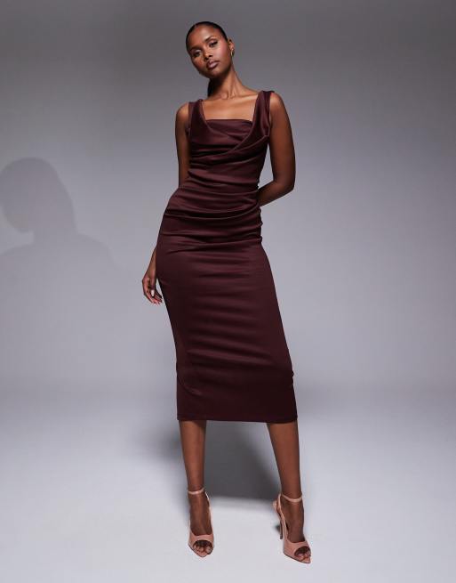 ASOS DESIGN square neck pleat bust midi pencil dress in chocolate