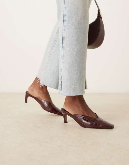 ASOS DESIGN Storm chisel toe mid heel mule in burgundy croc