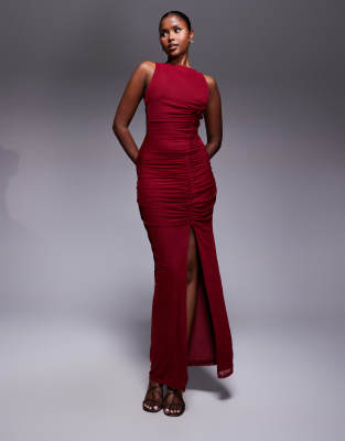 ASOS DESIGN strappy back ruched mesh maxi dress in dark cherry