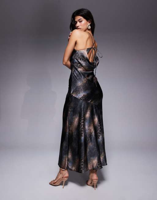 ASOS DESIGN strappy tie back cowl front satin maxi dress in dark snake print