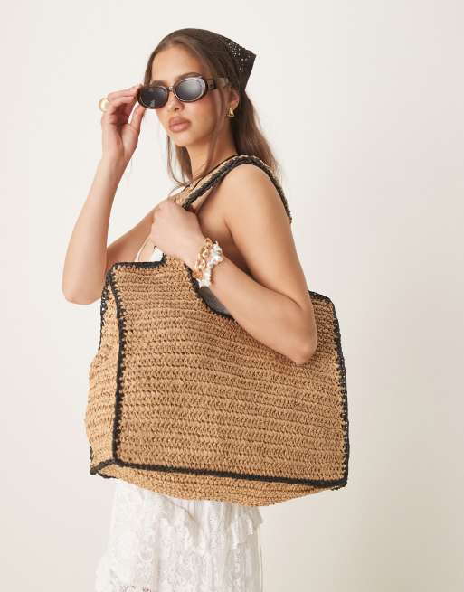 ASOS DESIGN straw crochet oversized tote bag in neutral with contrast edge detail
