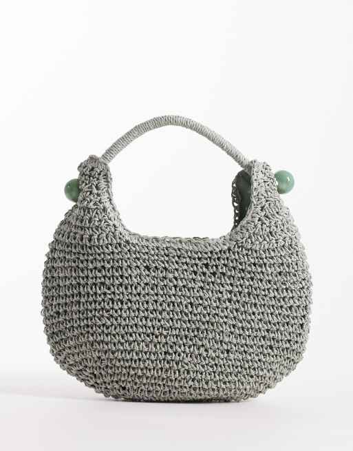 ASOS DESIGN straw hand crochet scoop grab clutch bag with resin ball detail in blue