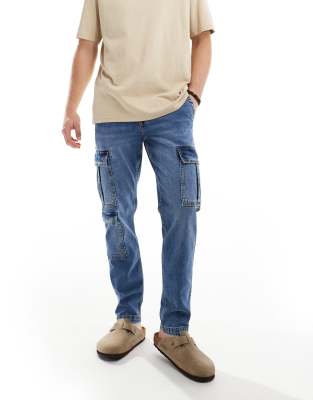 ASOS DESIGN stretch tapered jeans with cargo pockets in mid wash blue